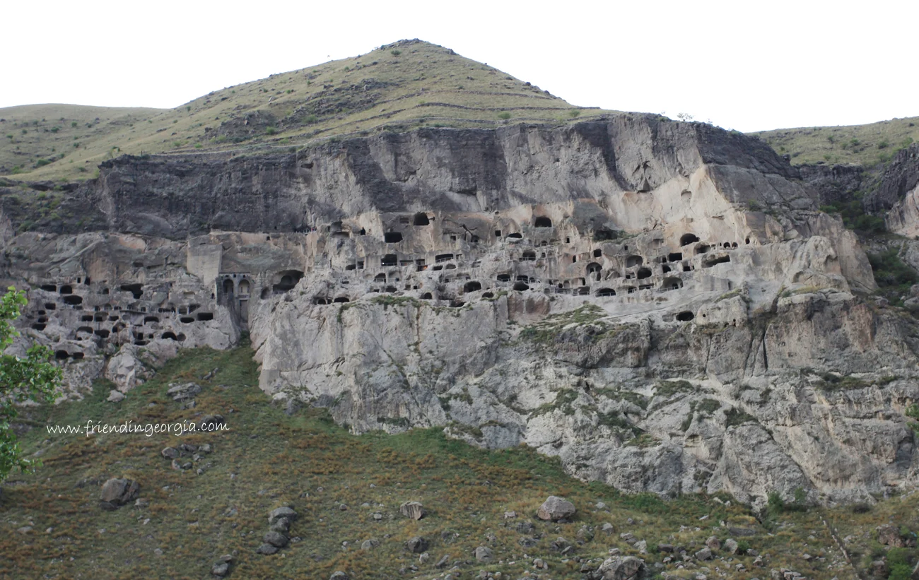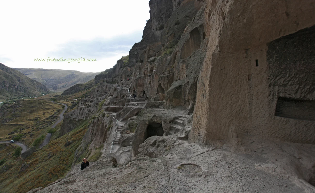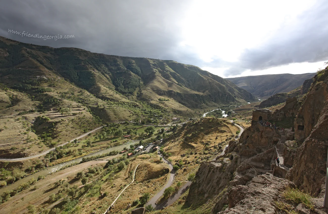Вот так Вардзиа выглядит издалека, с дороги. Мне кажется, с этого ракурса заметнее всего последствия землетрясения, которое и обнажило комплекс в 13 веке. До этого землетрясения было абсолютно невозможно заподозрить, что эти скалы скрывают такой обширный комплекс. Ну как тут не задуматься о том, что еще прячется от наших глаз, может быть, в самом неожиданном месте?